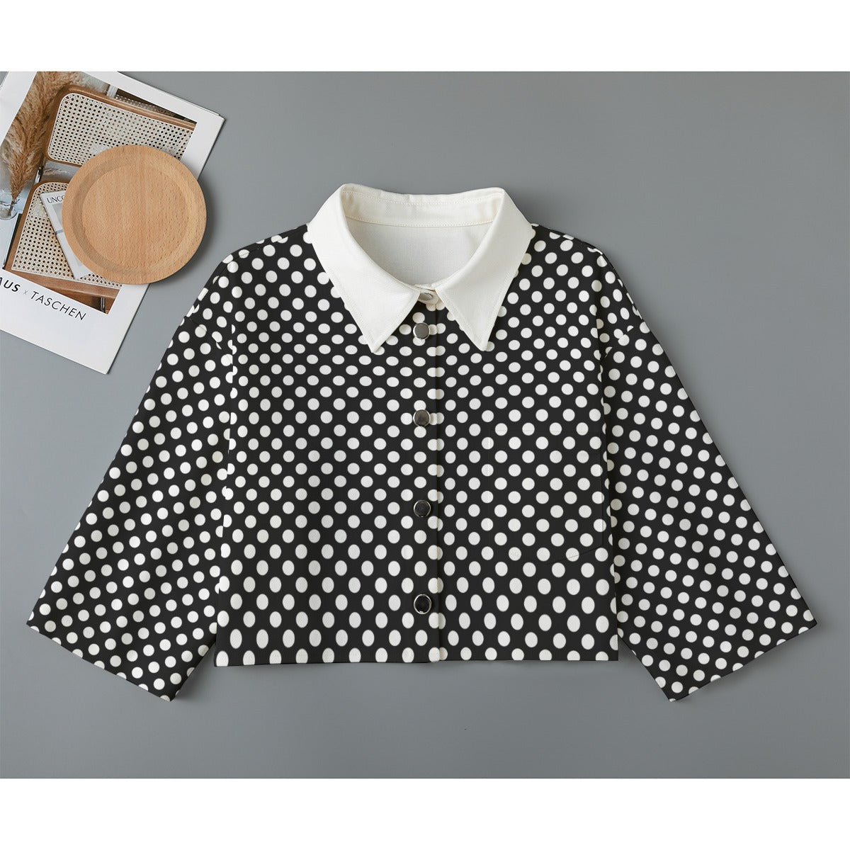 Show off your Retro vibe and MCM Fashion Sense with our Black and White Polka Dot Womens Cropped Jacket. Jackie O would have loved this jacket! Featuring mid-sleeves and a classic shirt collar that gives you a whole new level of fashion. There is a front pocket adding another element to the jacket. Feel confident on any occasion whether you are going out on the town or to the mall shopping. All eyes will be on you. Made of pure cotton material that's skin-friendly and breathable, the canvas texture is also sturdy and stylish, ensuring maximum comfort.